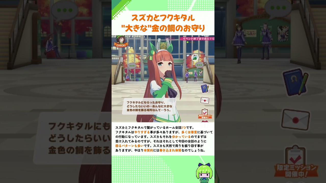 スズカとフクキタル「大きな」金の鯛のお守り #shorts #ウマ娘 Gaming Twitter Facebook はてブ Pocket LINE コピー 2025.12.07 サイレンススズカとマチカネフクキタルのホーム会話2つです。 スズカは「逃げシス」の時もそうですが、一旦受け入れてからどうしよう